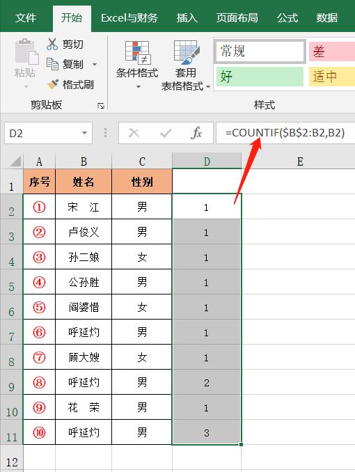 表格中需要把姓名列中重复的名字找出来。
